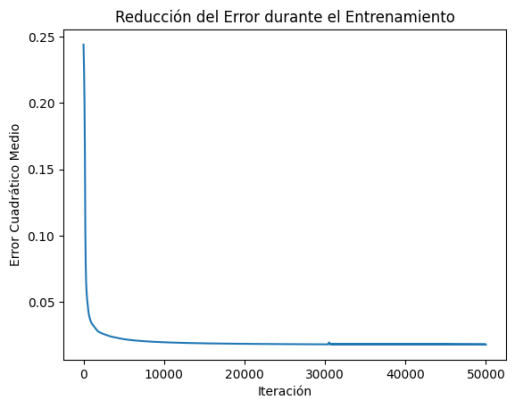 En el gráfico se visualiza cómo disminuye el error durante el entrenamiento. El eje x representa las iteraciones, mientras que el eje y representa el error cuadrático medio. Este gráfico proporciona una representación visual de cómo la red neuronal está mejorando a medida que se ajusta a los datos.